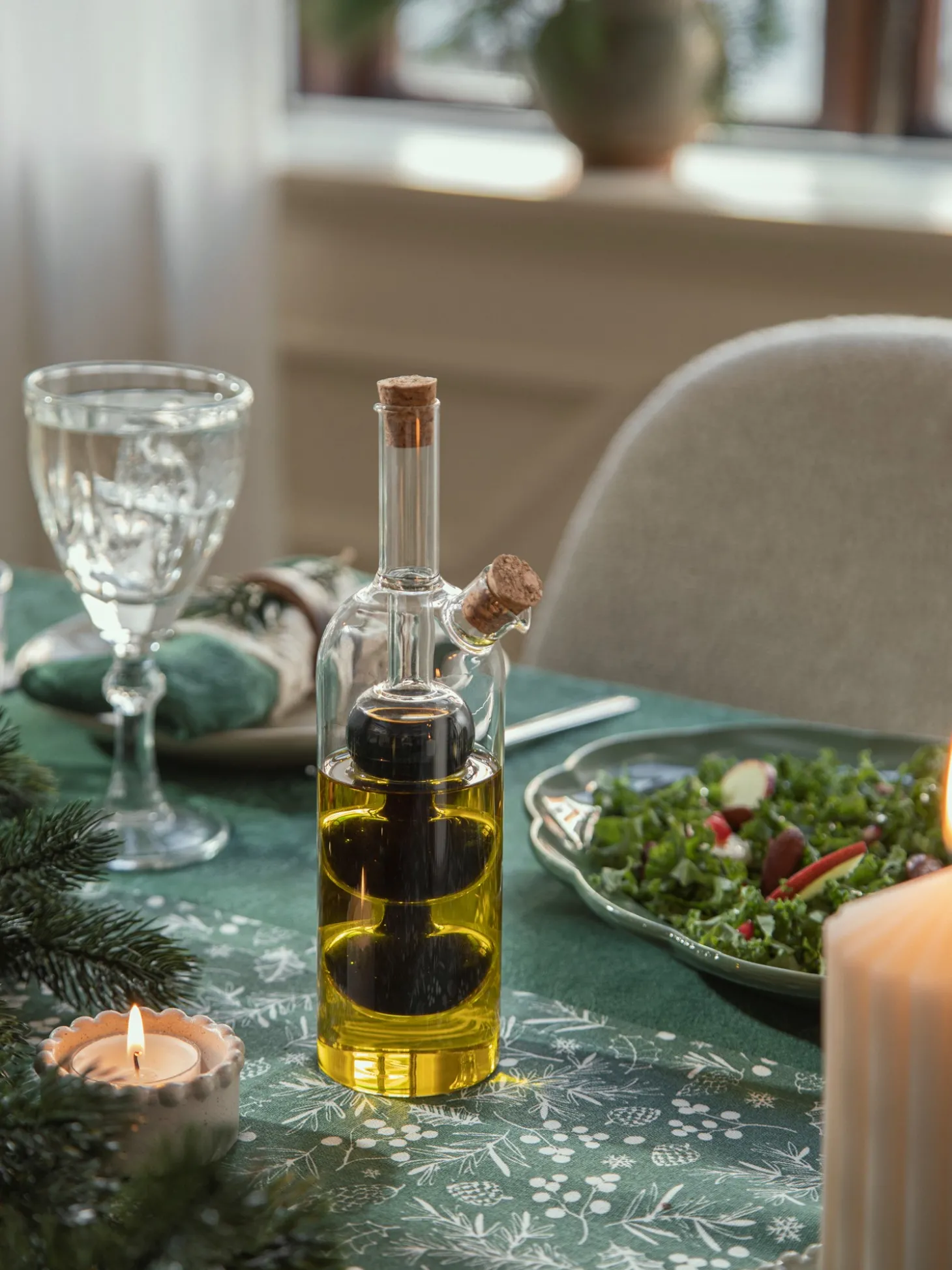 Søstrenes olieflaske er lavet af glas og har korkpropper. Flasken har to kamre, det ene kan indeholde op til 70 ml, det andet 200 ml. Om De fylder flaskerne med to slags olier, olie og eddike, eller noget helt andet, er helt op til Dem.
