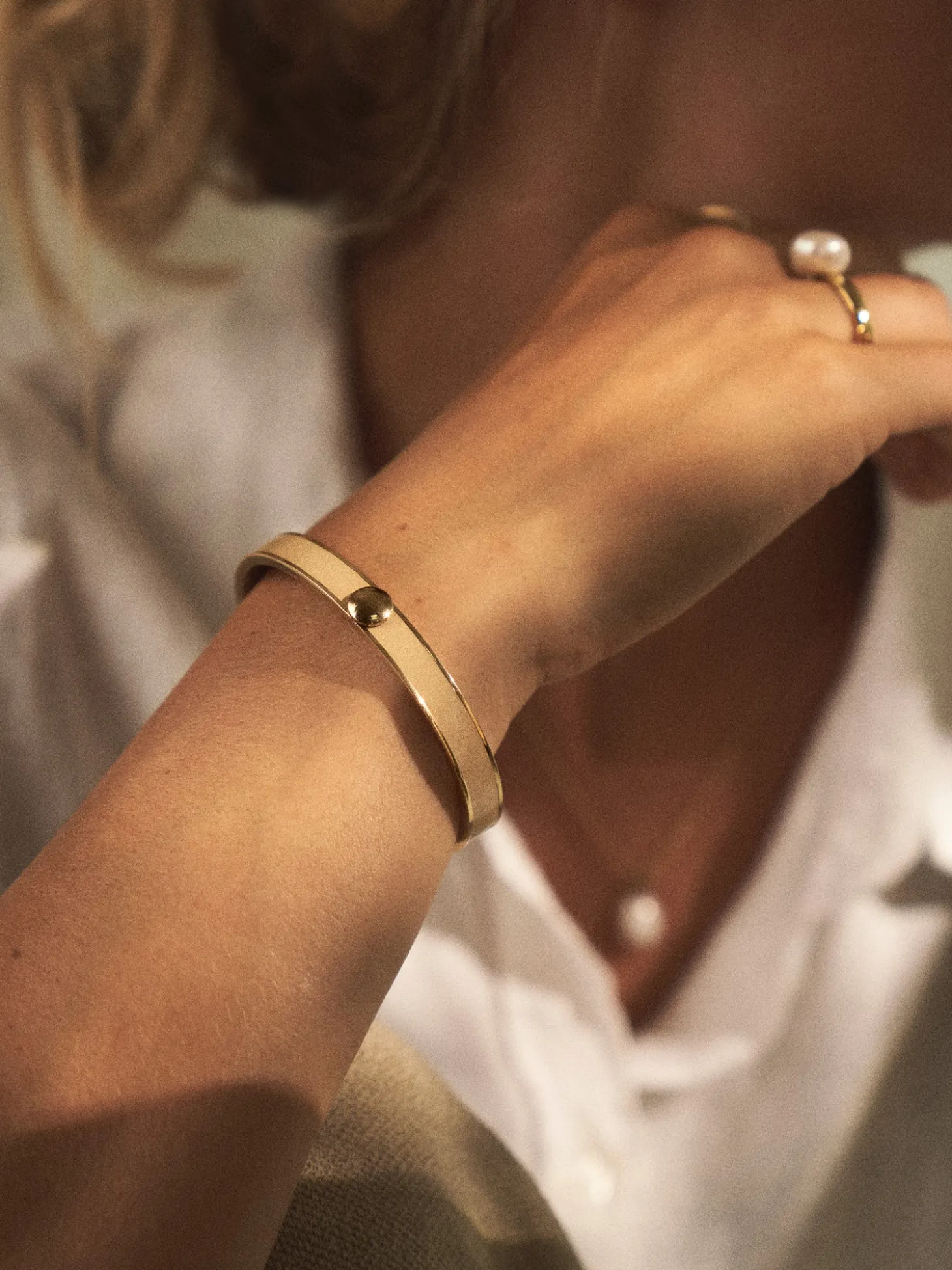 Capri-armbåndet fra Bud to Rose er et tidløst bangle-armbånd.Det er lavet af 14 karat forgyldt rustfrit stål og har en strimmel af emalje.Anna og Clara gør Dem venligst opmærksom på, at De bør undgå direkte kontakt med fugt og væske for en længere holdbarhed af guldbelægningen. Desuden anbefales det at tage smykker af, før De går i bad, træner og sover for at beskytte deres skinnende overflade.