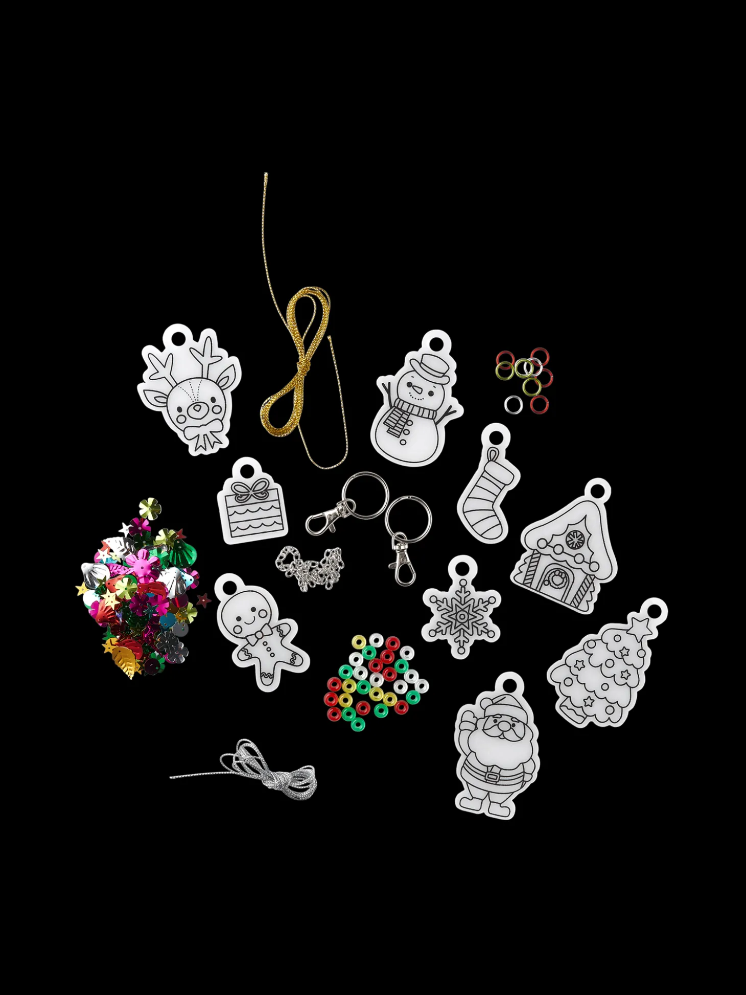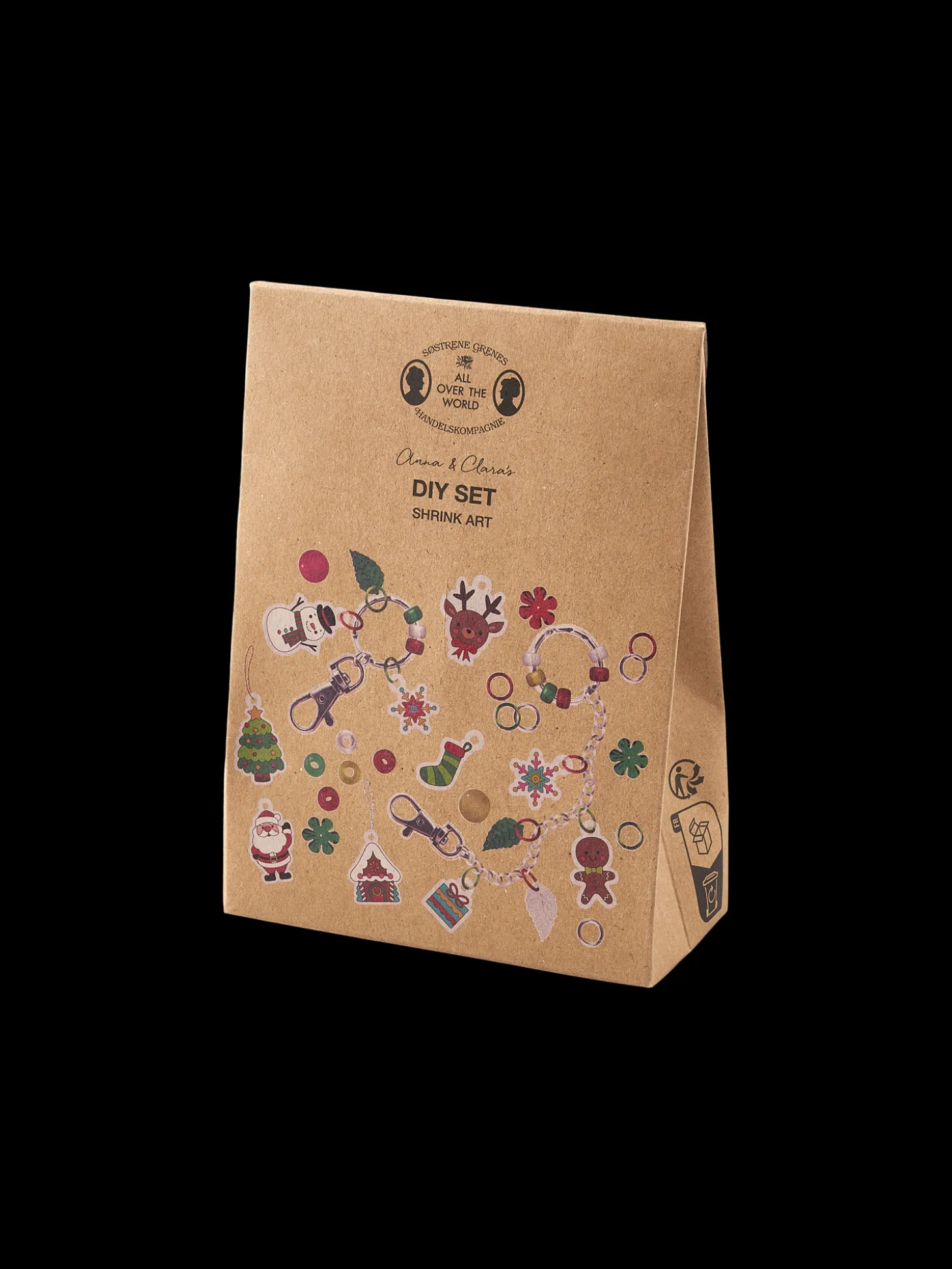 Søstrenes krympeplastsæt indeholder 30 perler i blandede farver, 40 pailletter i blandede former og farver, perlesnor på 2 m i to farver, 10 forskellige krympeplastfigurer, 10 farvede ringe og 2 nøgleringe.