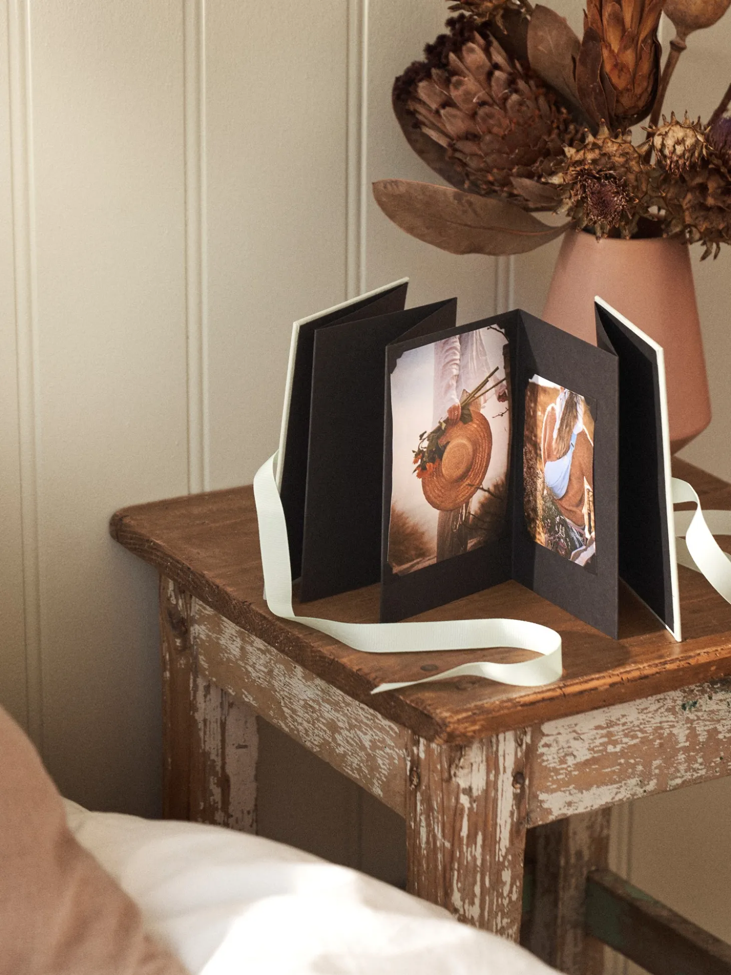 Harmonikaalbummet fra Semikolon er lavet af robust sort karton og er lærredsindbundet. Det åbnes ved at blive foldet ud og kan lukkes med et bånd. Der er plads til 14 billeder med en størrelse på 10 x 15 cm.