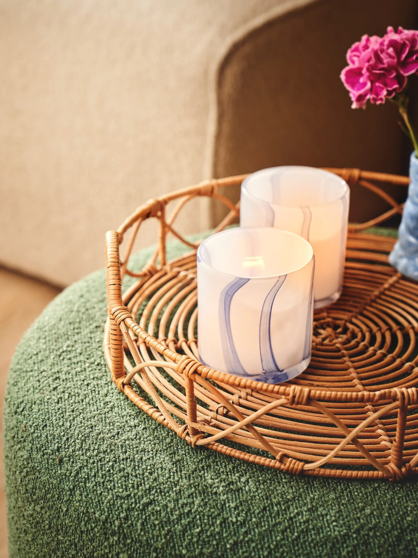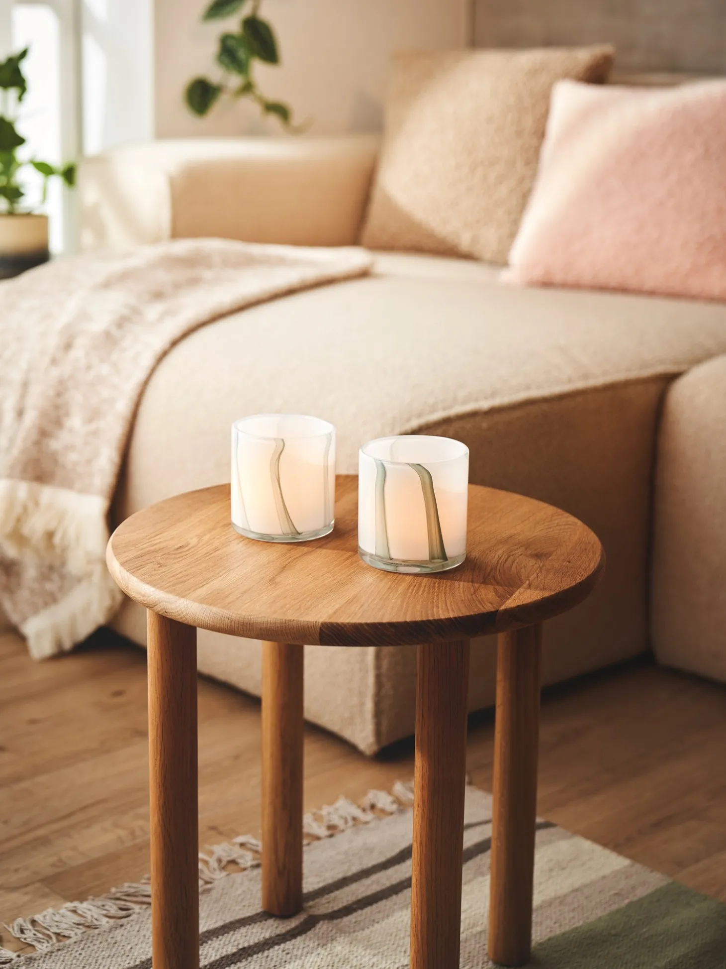 Søstrenes fyrfadsstage er lavet af glas. Den har en diameter på 8,5 cm og en højde på 9 cm.