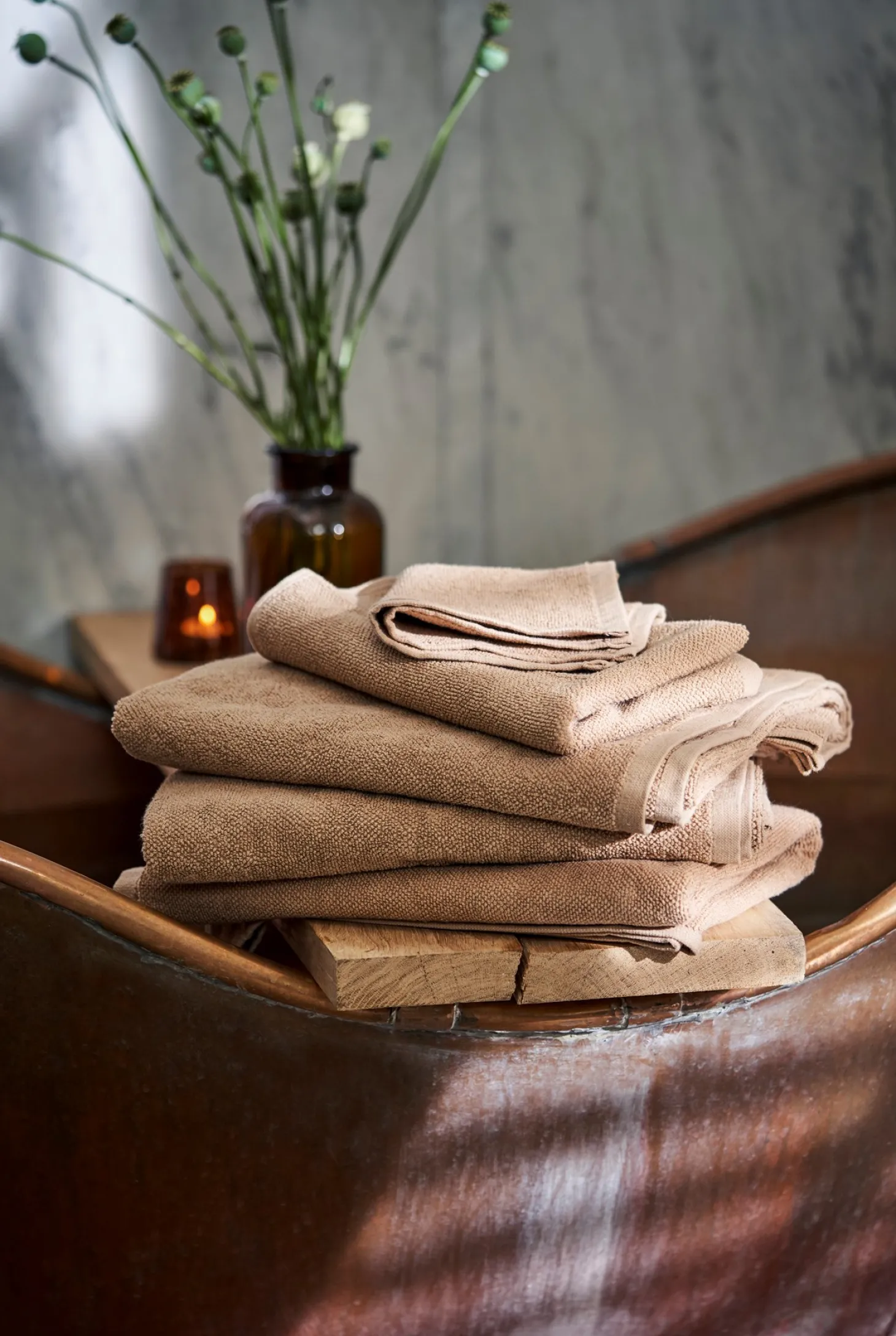 Søstrenes håndklæder er lavet af bomuld og måler 70 x 50 cm. Clara indretter sit badeværelse med et duftlys, en lille plante og sine nye, bløde håndklæder. “Bløde materialer skaber en følelse af hverdagsluksus,” siger hun.