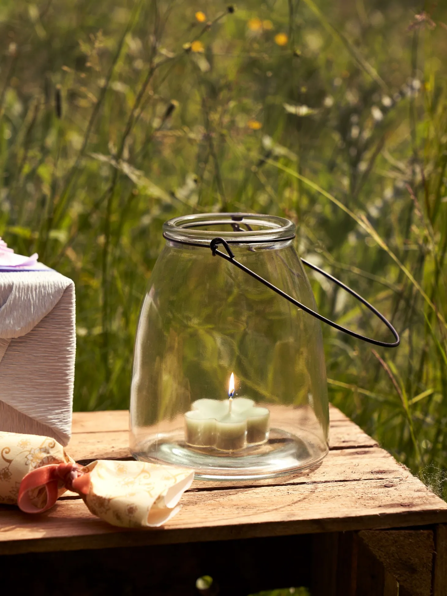 Søstrenes hurricane-lysestage har en højde på 28 cm med håndtaget og 13 cm uden. Åbningen måler Ø8 cm, mens bunden måler Ø13 cm.