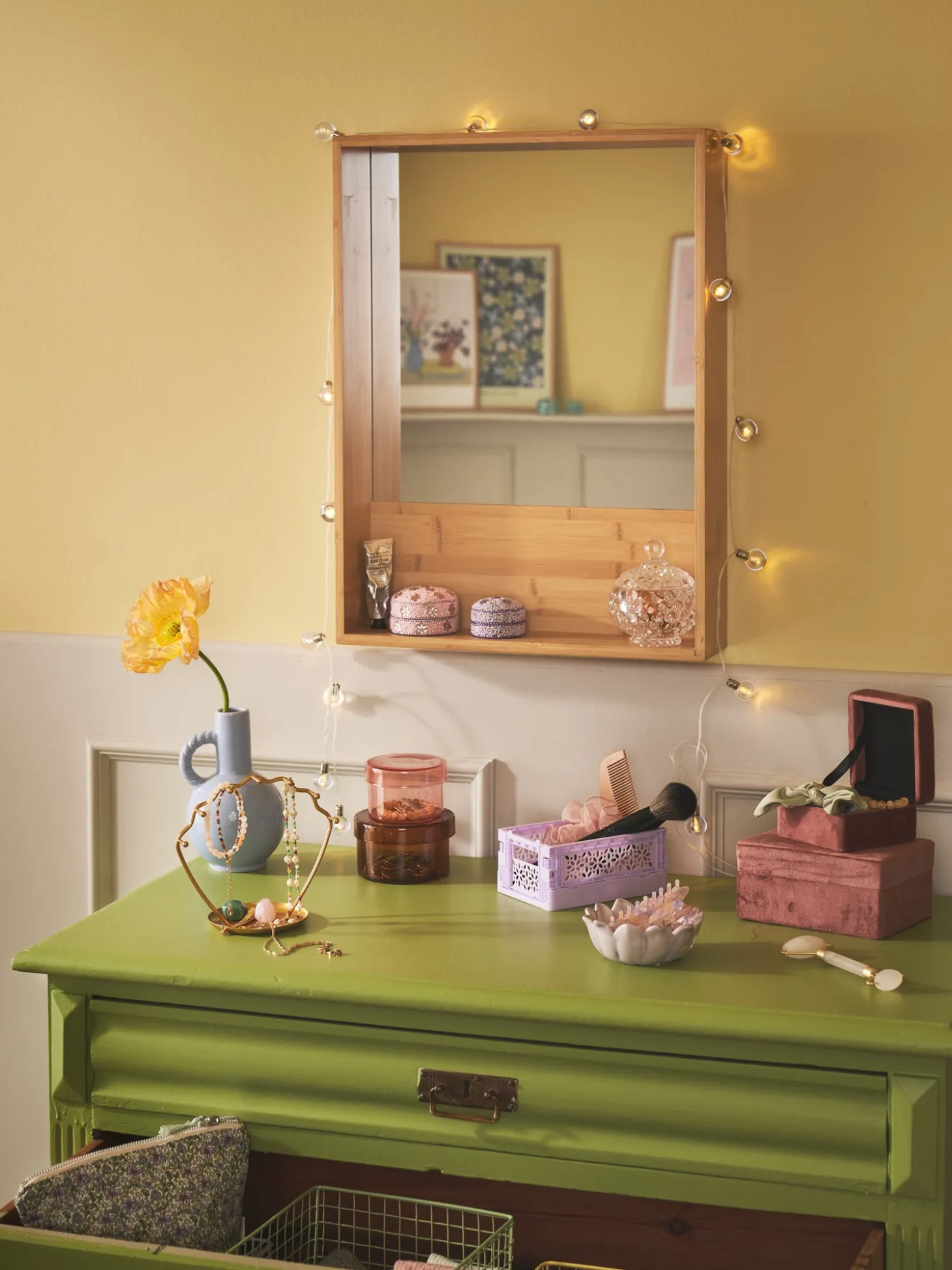Søstrenes hylde med spejl er lavet af 100% FSC®-certificeret bambus og måler 41 x 10 x 55 cm.