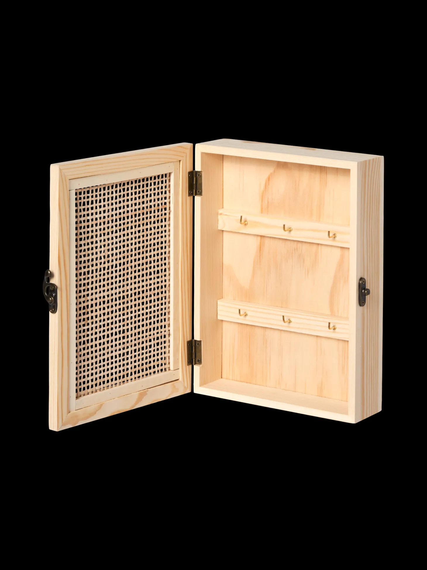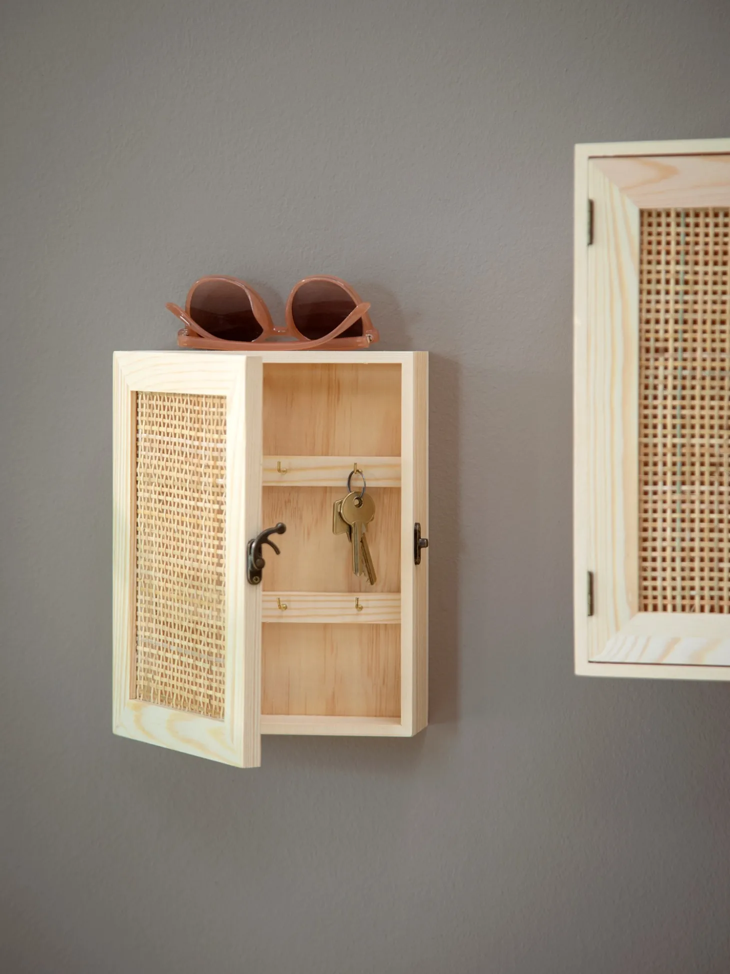 Søstrenes nøgleskab er lavet af FSC®-certificeret fyrretræ, krydsfiner og rattan.