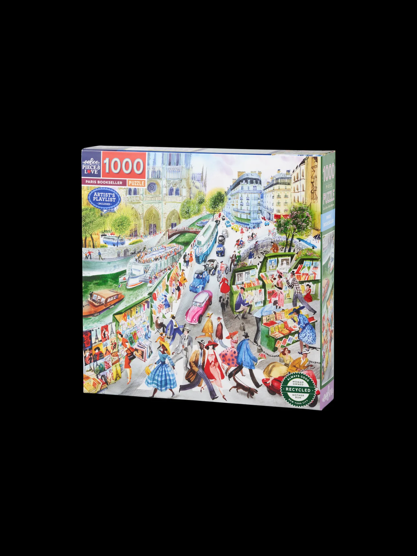 Paris Bookseller puslespillet fra eeBoo er lavet af papir og måler 58,4 x 58,4 cm, når det er samlet. Puslespillet har 1000 brikker. Illustrationen er lavet af Victoria Krylov.