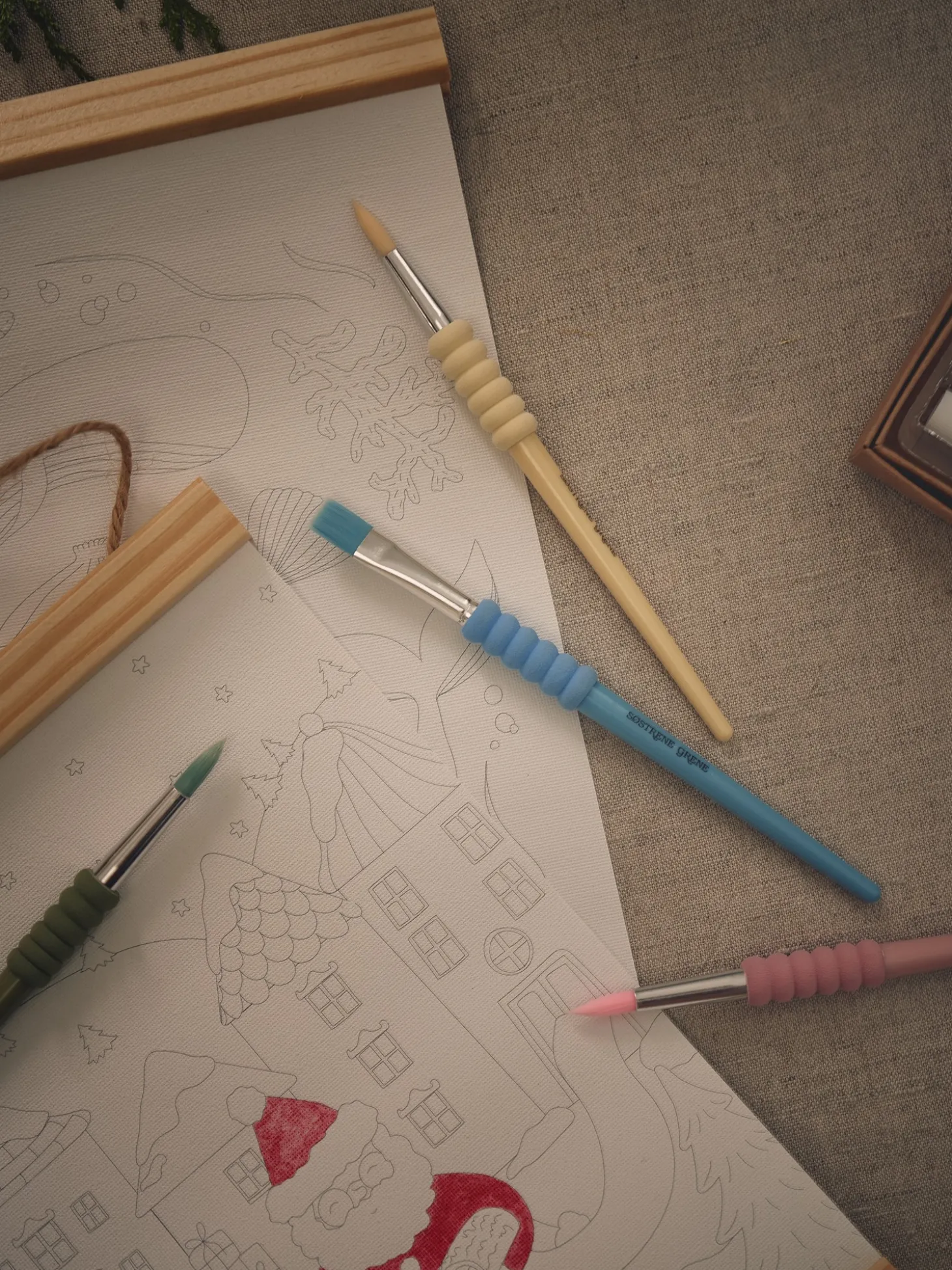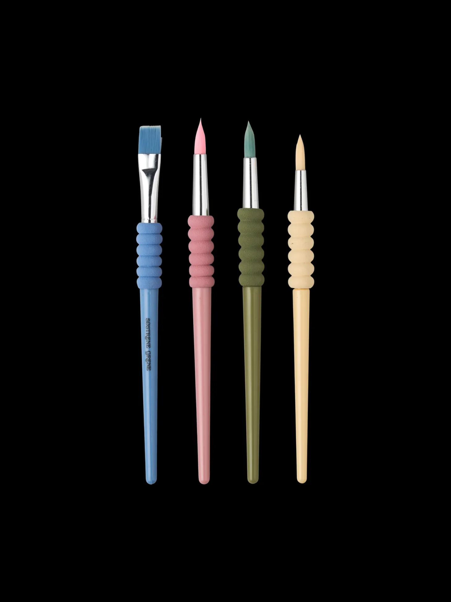 Søstrenes børstesæt indeholder 4 pensler, 3 med spidse børstehoveder og 1 med fladt børstehoved. Penslerne har polystyrenhåndtag og nylonbørster samt en blød midterdel af polyuretan, der giver et behageligt greb.