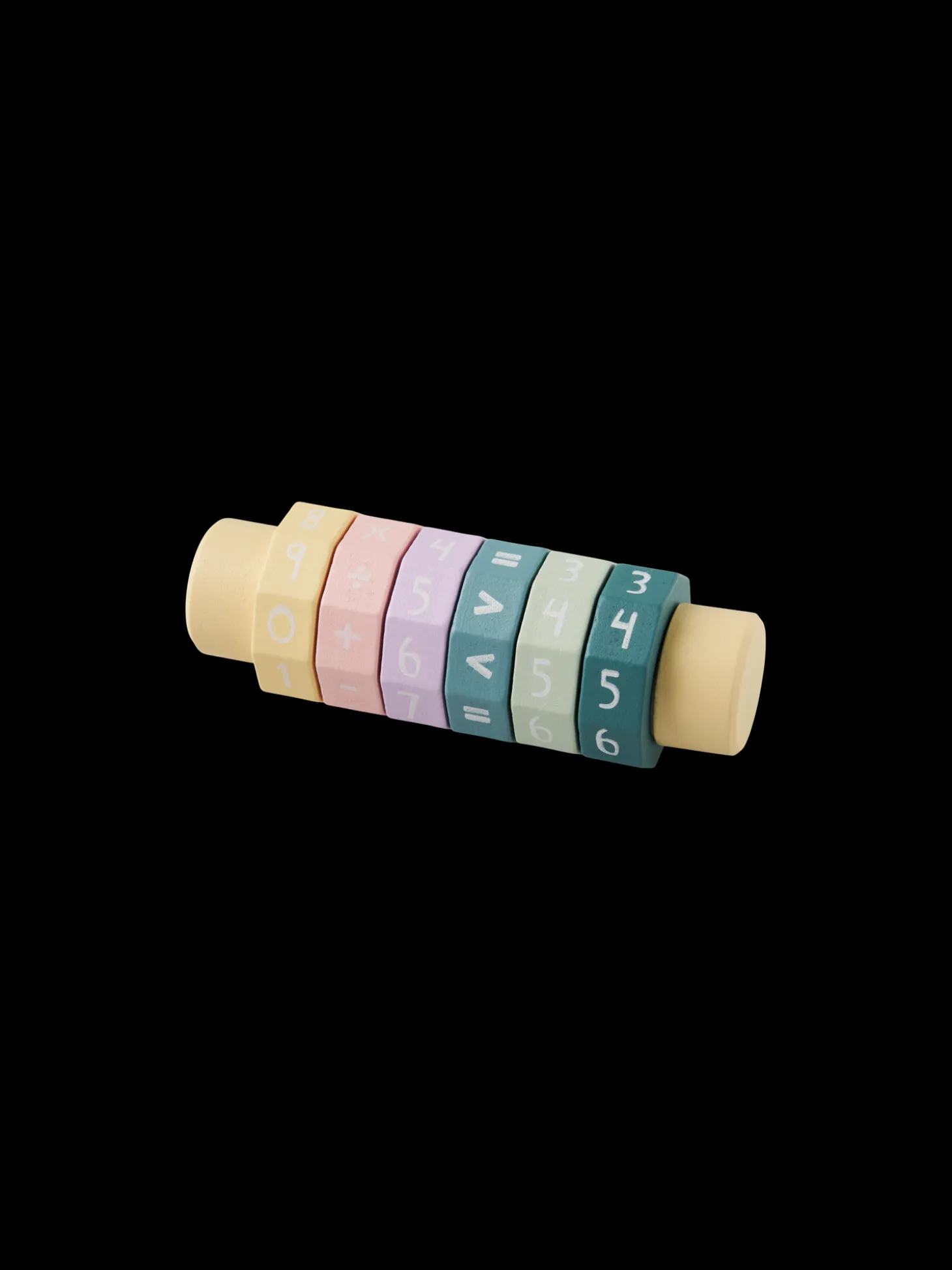 Søstrenes regnerulle er lavet af 100 % FSC®-certificeret schima superba og MDF. Den måler 4,9 x 5 x 14 cm.De kan lave ligninger ved at dreje knapperne på rullen til tal og matematiske symboler.