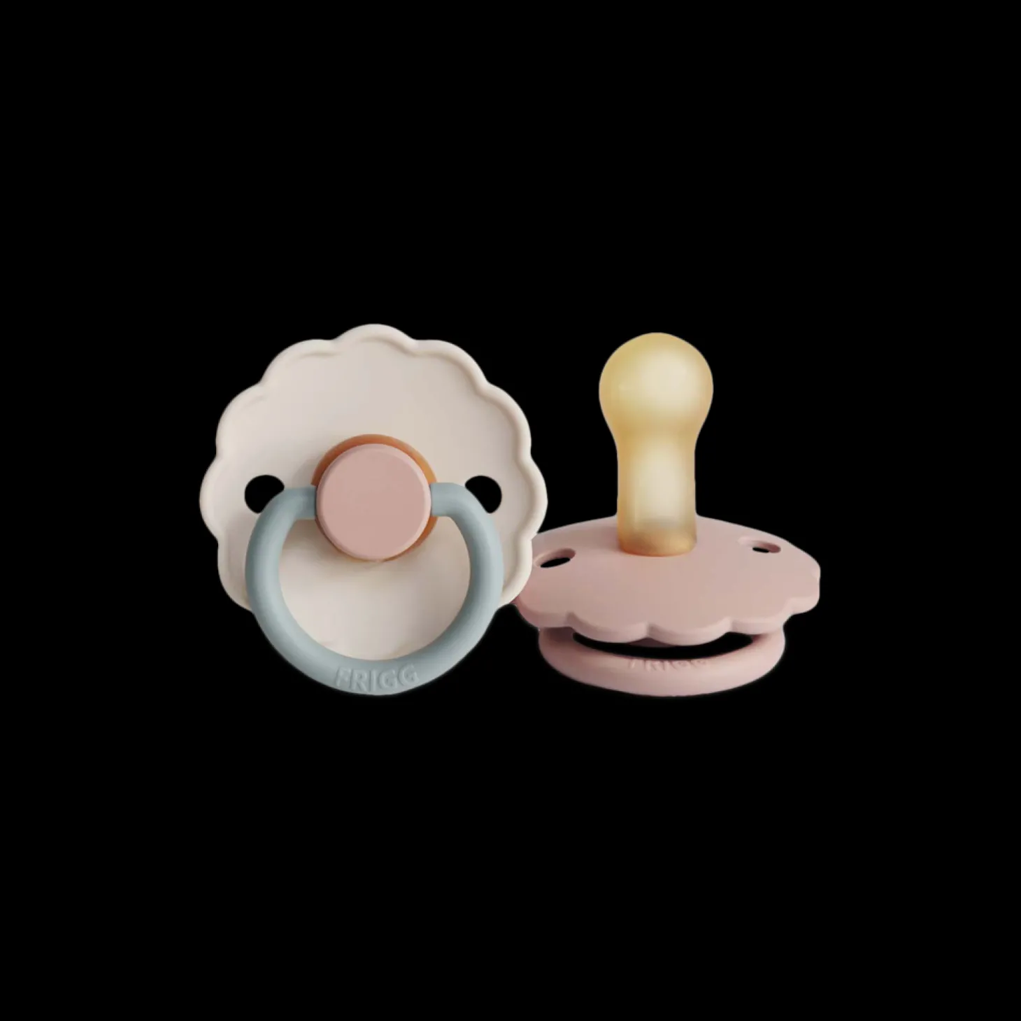 Daisy-sutterne fra det danske mærke FRIGG er designet og produceret i Danmark. Pakken indeholder 2 FRIGG-sutter. Sutterne har låsemekanismen click-lock® og en ny SilkySoft™ overflade. Sutten er lavet af 100% naturgummi og kommer i en størrelse 2, ideel til alderen 6-18 måneder. Sutten er rund og måler 30 mm. Daisy-sutterne fra FRIGG har yndige, flossede kanter, der minder om en særlig blomst: Tusindfryden, som er Danmarks nationalblomst. Denne pakke indeholder en Blush-farvet sut og en Cotton Candy-farvet sut. Søstrene gør opmærksom på, at sutterne bør udskiftes hver 4.-8. uge af hygiejniske årsager og for optimal sikkerhed. De bør altid tjekke sutten før brug og kassere den ved første tegn på beskadigelse eller slid.