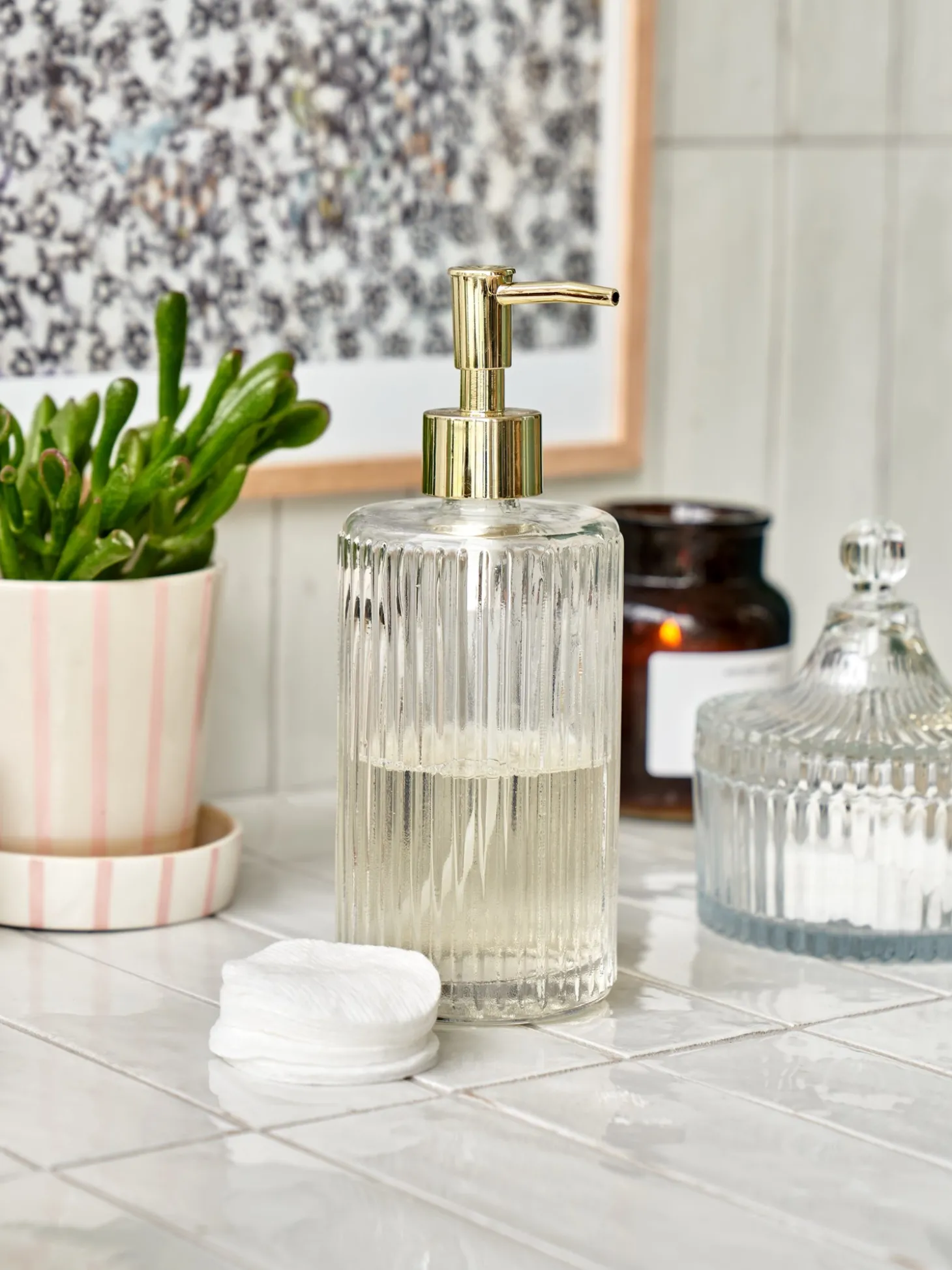 Personlig pleje er meget vigtig for Anna og Clara og afspejles i udvalget af badeværelsestilbehør, der er opstillet i deres charmerende badeværelse. Søstrene er ret vilde med denne dejlige sæbedispenser og det faktum, at den er genopfyldelig.”Fyld dispenseren med Deres yndlings flydende sæbe,” anbefaler Clara, mens hun vasker sine hænder i en duftende, skummende håndsæbe. “En håndsæbe bruges mange gange om dagen og efterlader Deres hænder rene og friske.”
