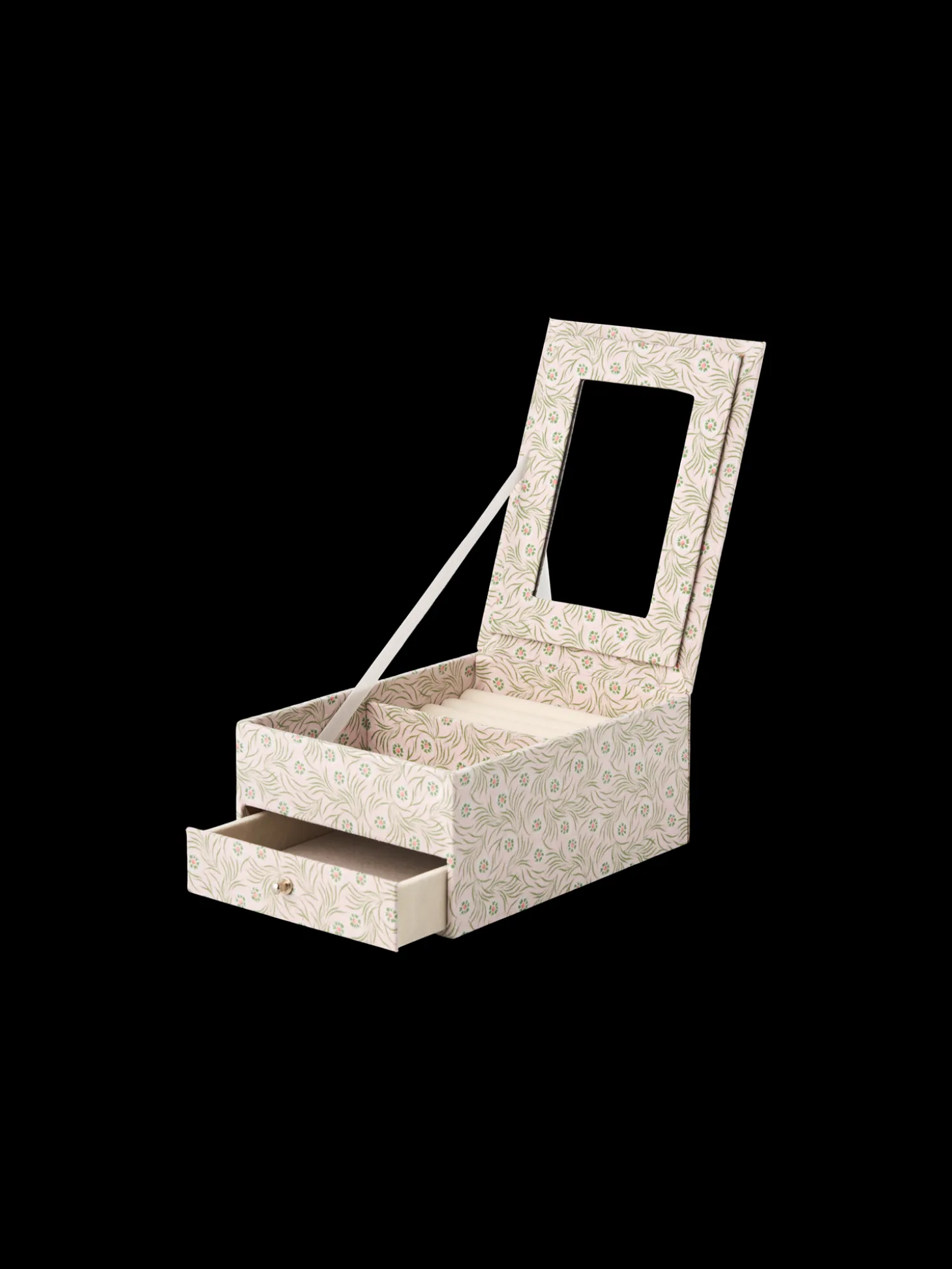 Søstrenes smykkeskrin har en 100% FSC®-certificeret fyrretræsbase beklædt med velour. Låget har et spejl, og der er masser af skuffer til at holde alle Deres skatte sikre.