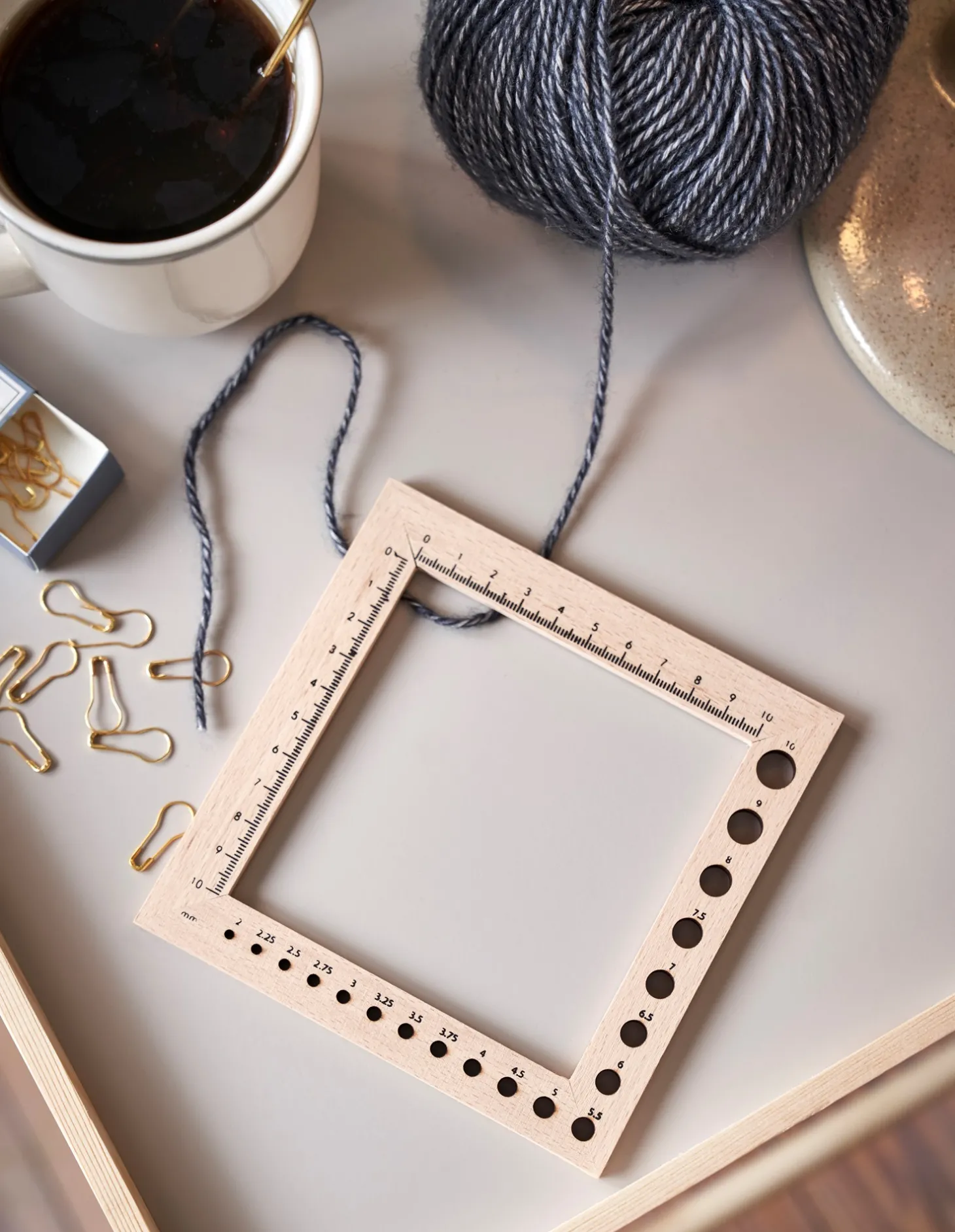 Søstrenes strikkefasthedsmåler er lavet af birketræ og måler 13,5 x 13,5 cm.