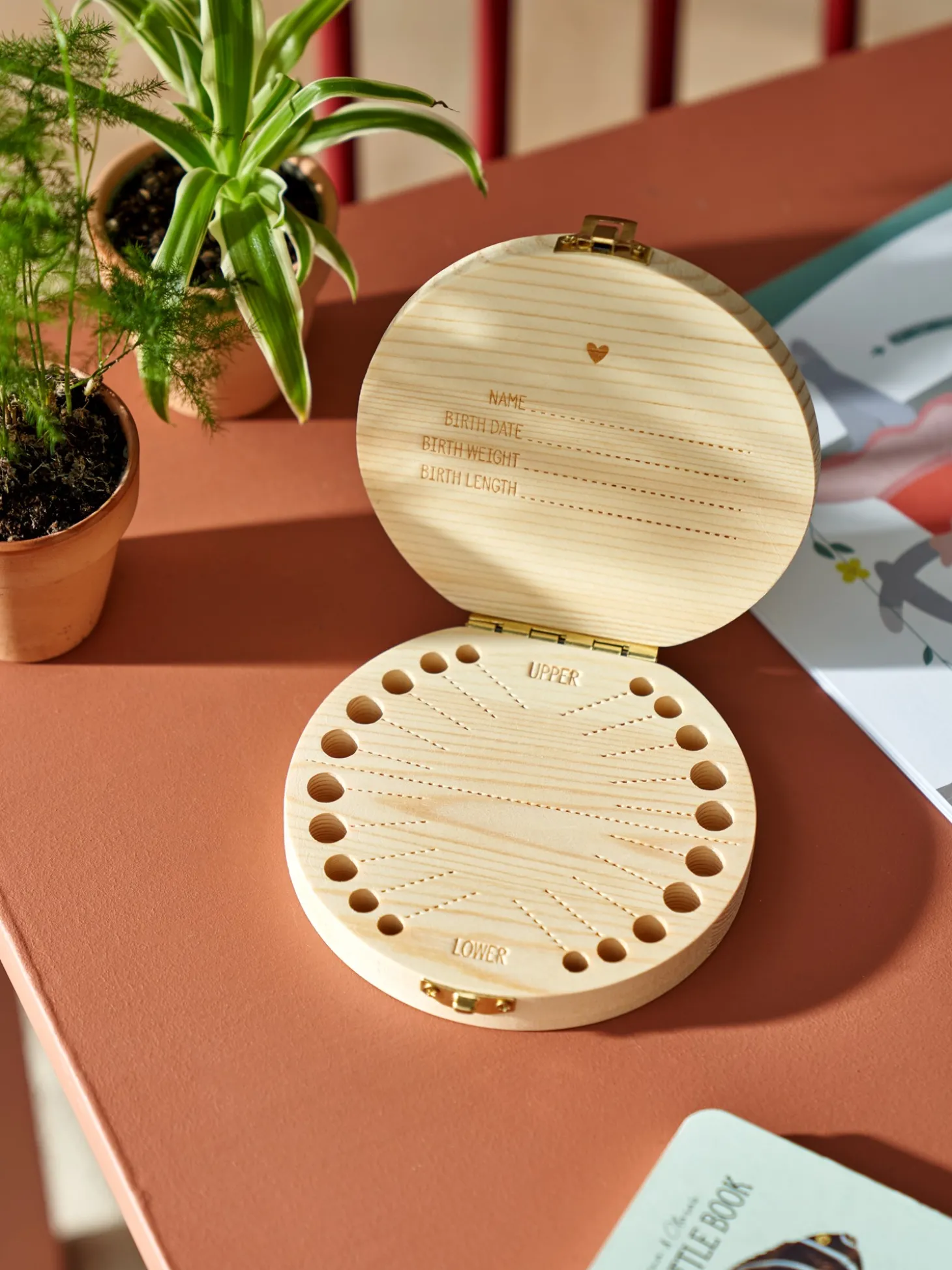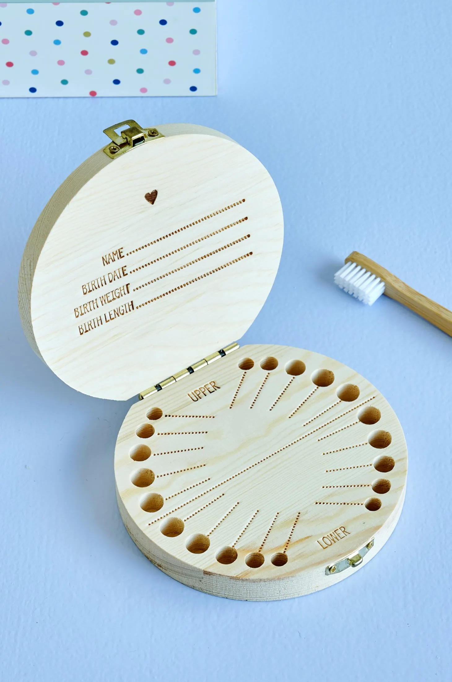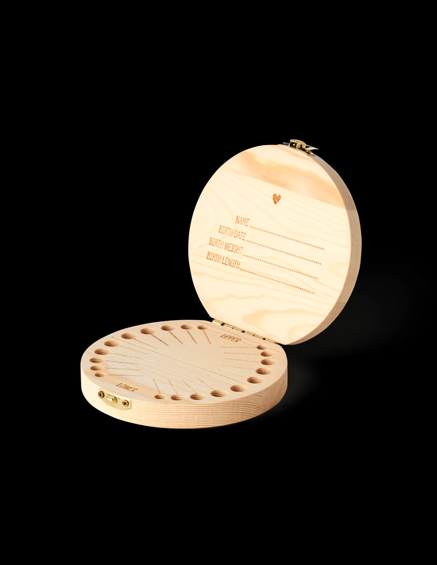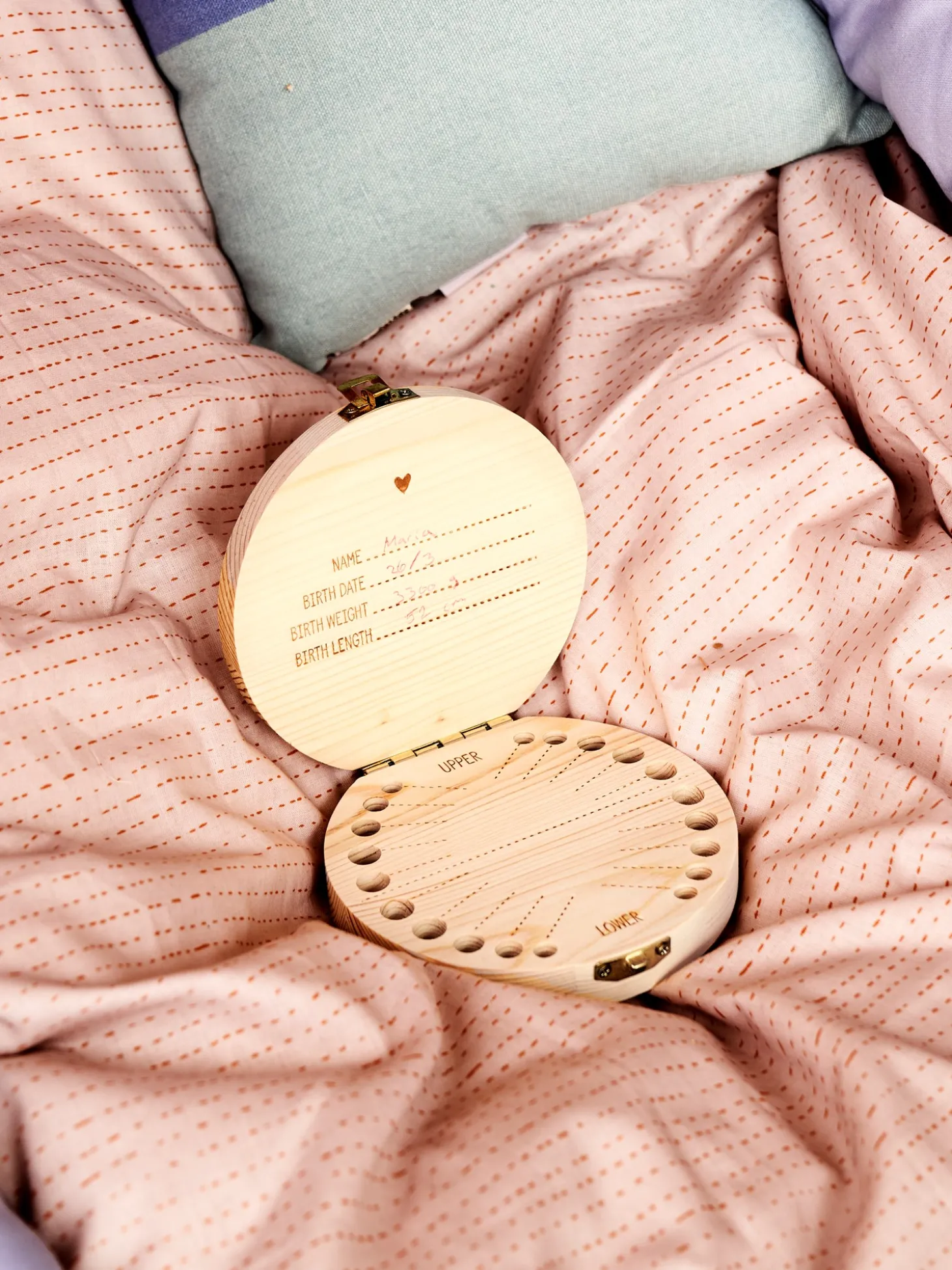 Søstrenes tandæske er lavet af FSC®-certificeret fyrretræ og måler 12 cm i diameter. Der er plads til at skrive navn, fødselsdato, fødselsvægt og fødselslængde inde i låget, samt datoer ud for hver enkelt tand.